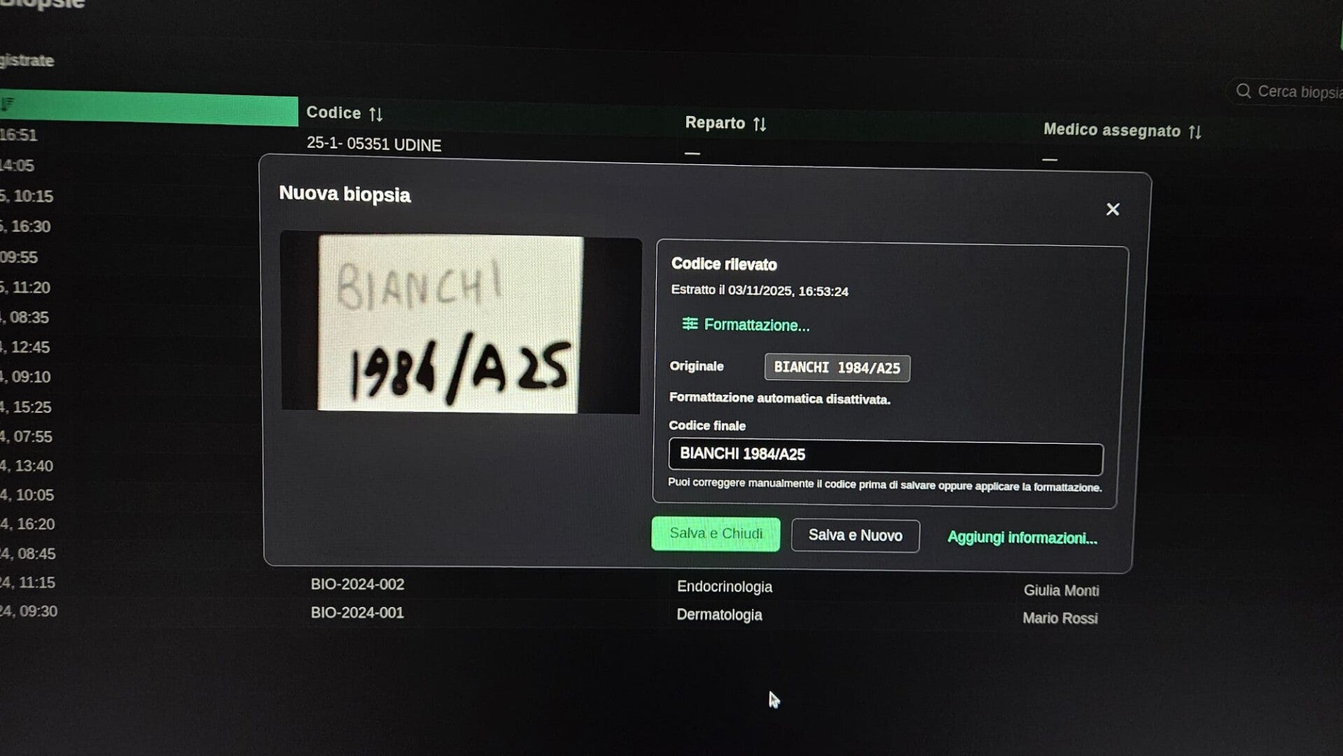 Tra i nostri progetti più recenti, spicca lo sviluppo di un sistema di Intelligenza Artificiale dedicato alla lettura e catalogazione dei reperti cito-istologici. Il sistema è specificamente ottimizzato per riconoscere e interpretare dati su blocchetti e vetrini "legacy", inclusi quelli privi di Data Matrix e con informazioni scritte a mano, risolvendo così il problema della tracciabilità storica.